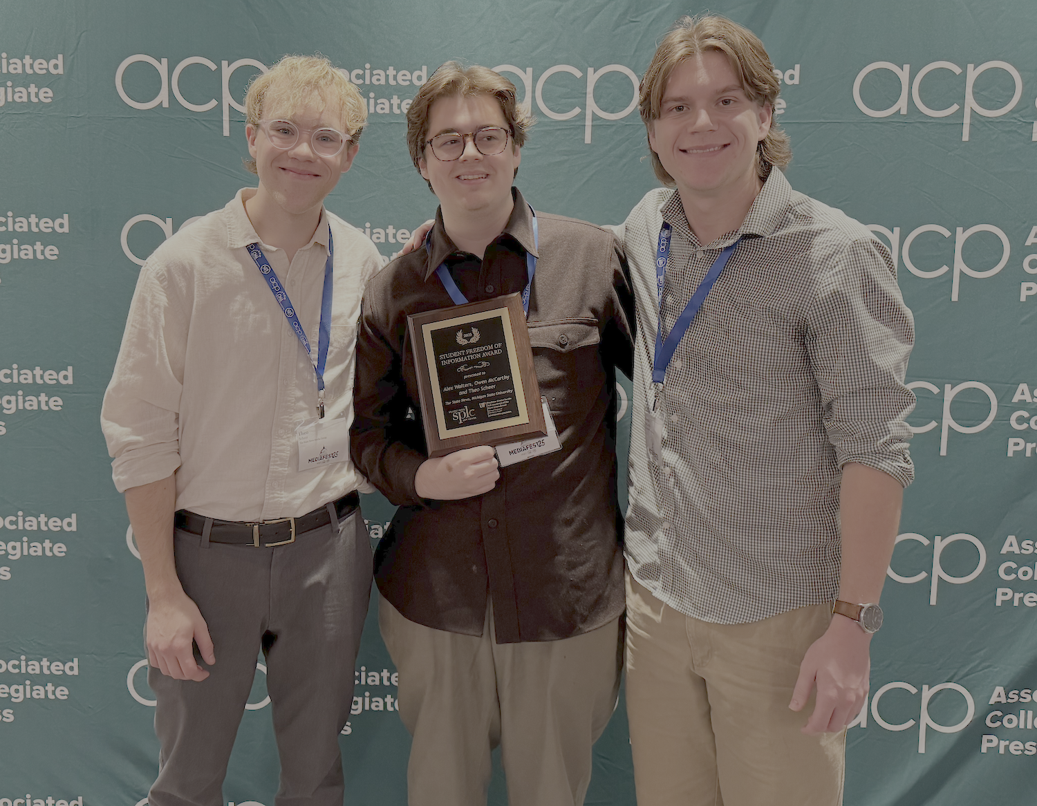 (From left) Theo Scheer, Alex Walters and Owen McCarthy after they accepted the Student Press Law Center’s Student Freedom of Information Award for their work with public records at Michigan State University. (Photo by Kimberly Margolis)